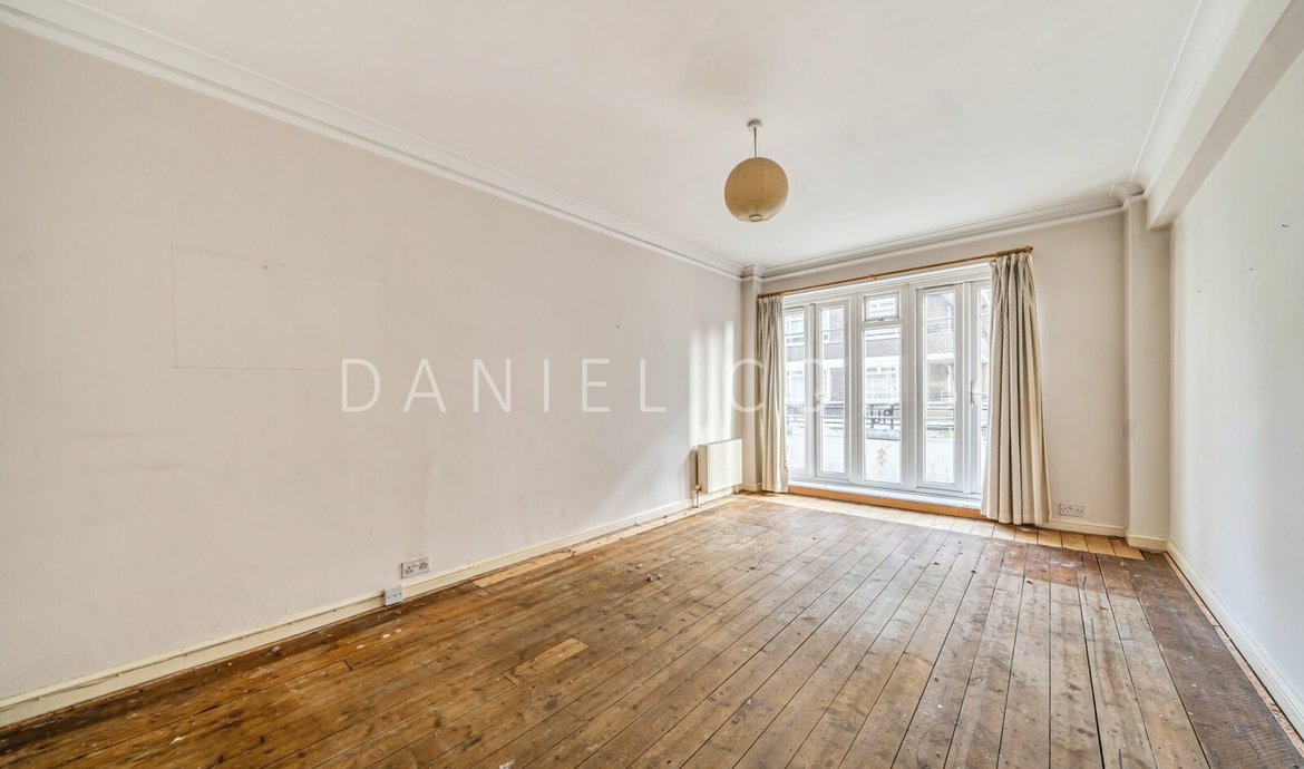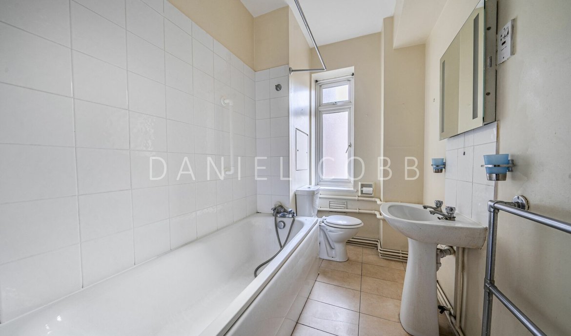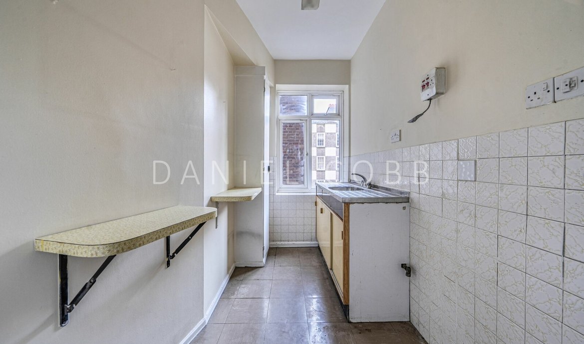 The apartment presents a rare blank canvas for a discerning purchaser to create a bespoke contemporary home. The property offers generous accommodation, including a spacious reception room with lovely double doors leading to a balcony, separate kitchen, double bedroom and bathroom, all with excellent potential to enhance and renovate, subject to the usual consents. Both the kitchen and bathroom have good sized windows ensuring plenty of natural light throughout, and there are also lovely mid century internal glass doors.