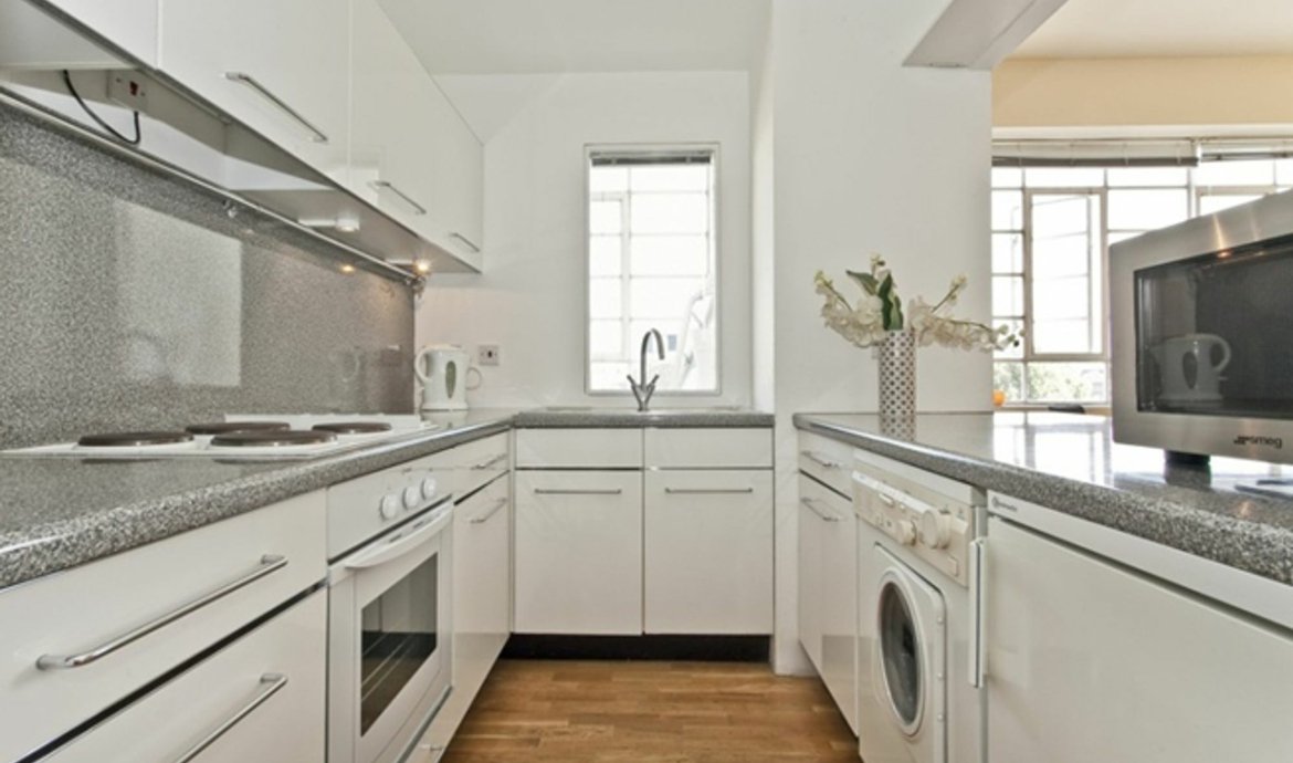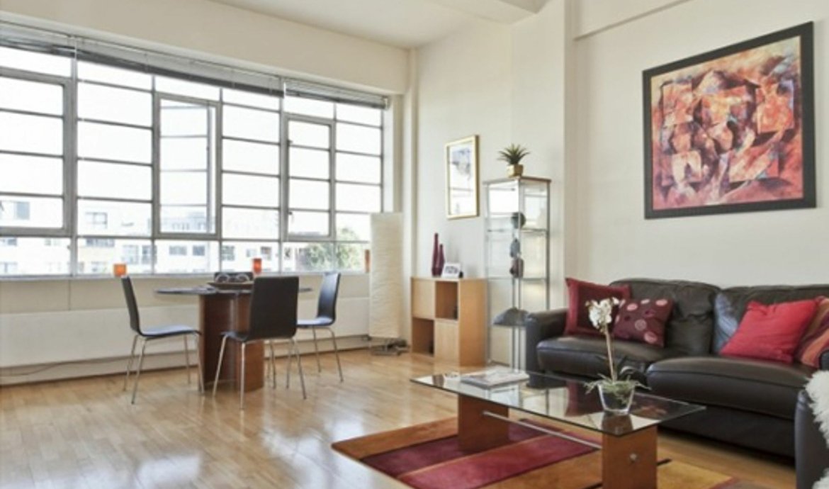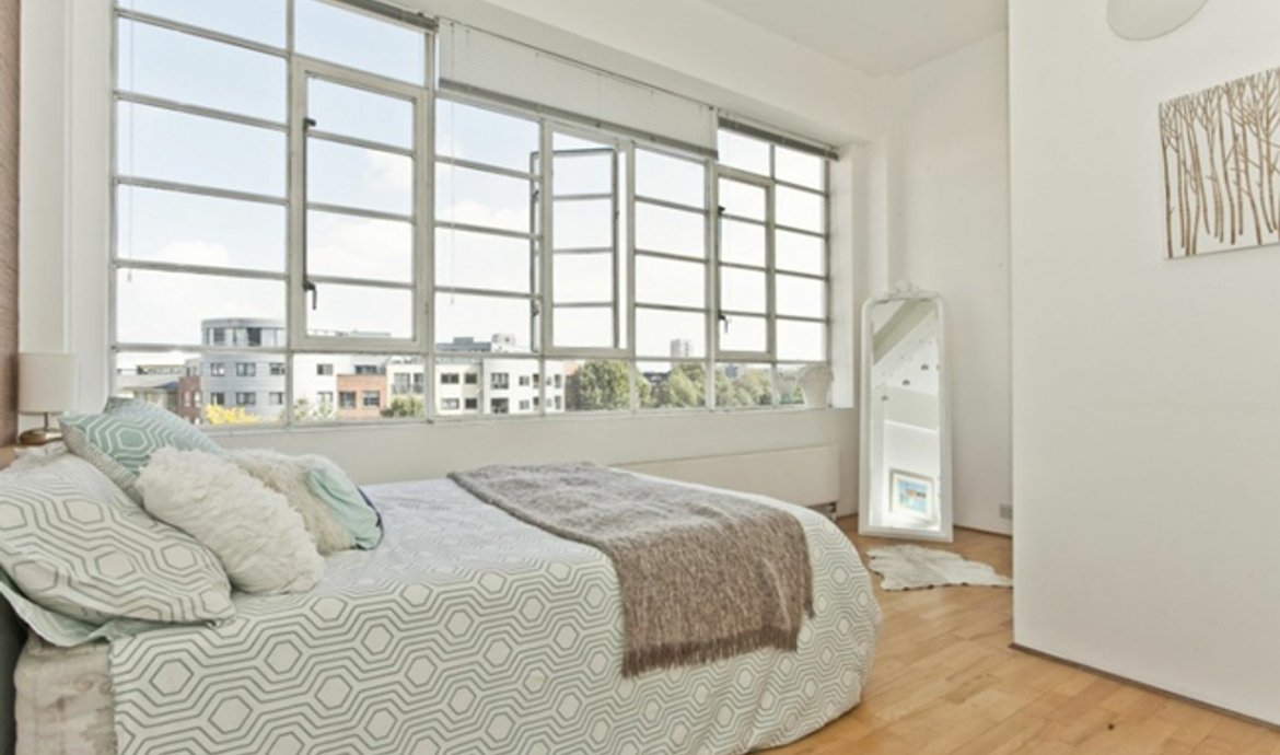 An excellent warehouse style apartment in this select gated development, with an impressive living space, including high ceilings and wooden floors. It is flooded with natural light from the wide expanse of original industrial windows, providing fabulous uninterrupted views to the north. The adjacent kitchen is fully fitted and equipped, and the double bedroom with excellent storage space also enjoys wonderful views to the north.