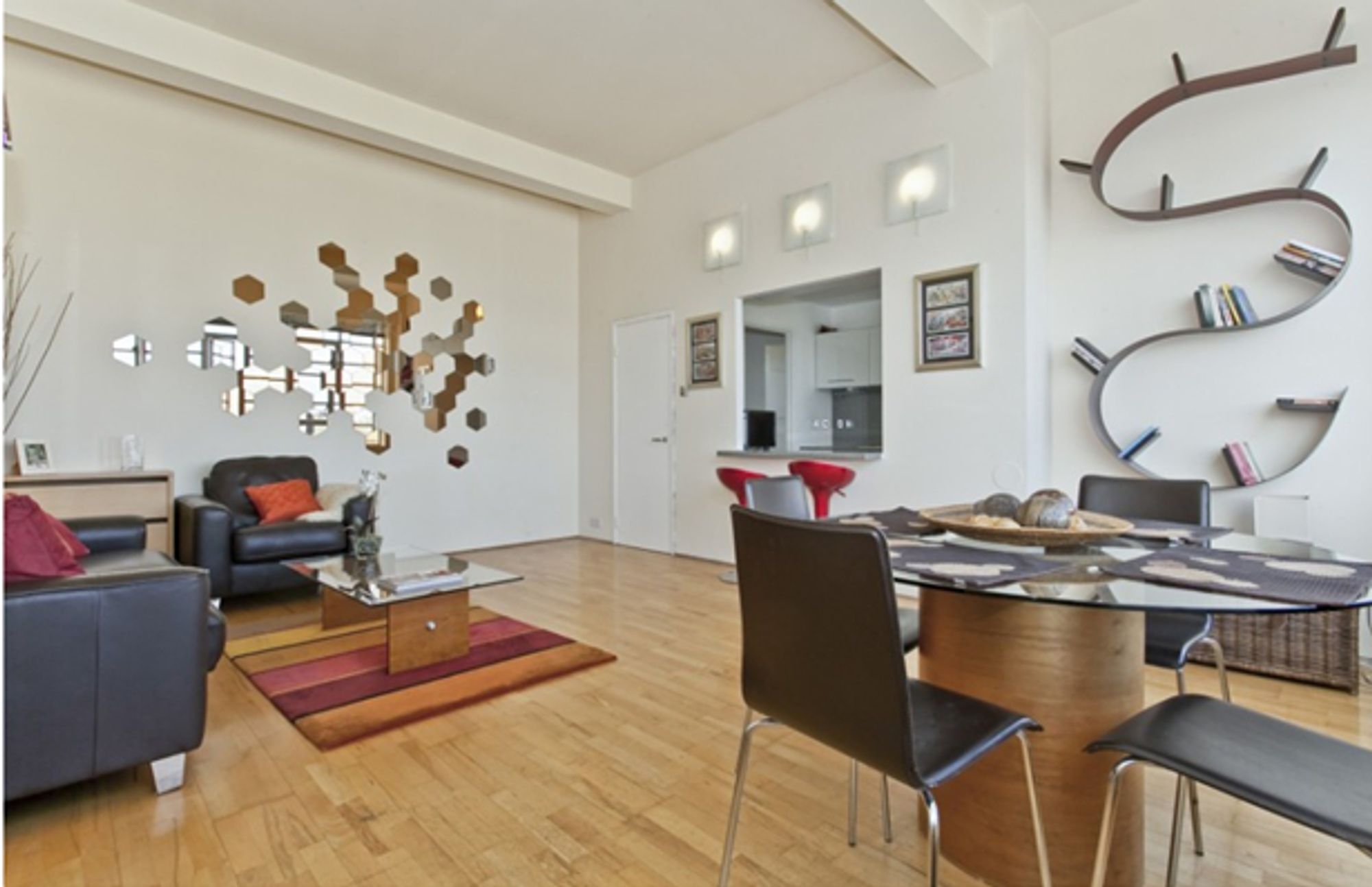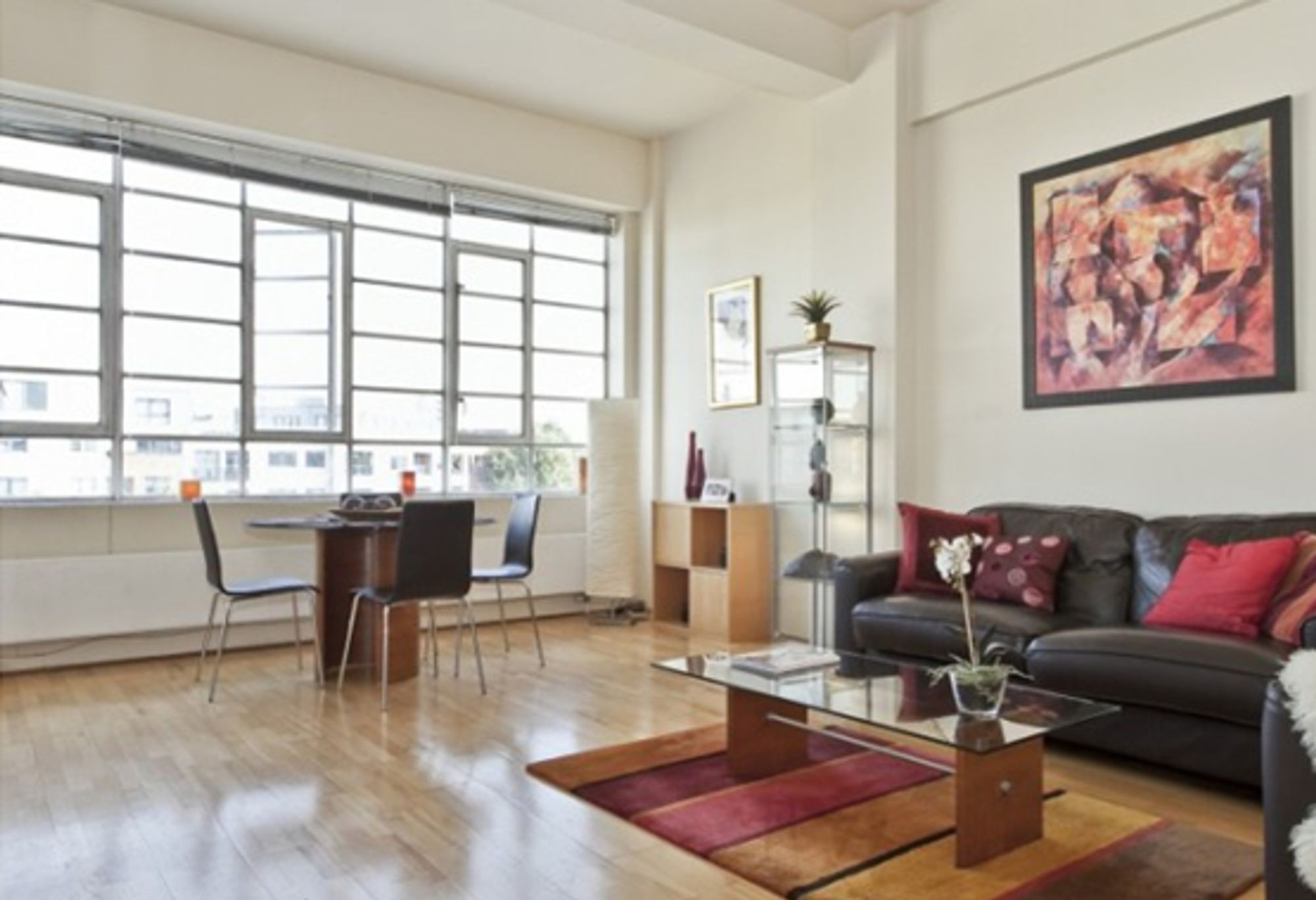 An excellent warehouse style apartment in this select gated development, with an impressive living space, including high ceilings and wooden floors. It is flooded with natural light from the wide expanse of original industrial windows, providing fabulous uninterrupted views to the north. The adjacent kitchen is fully fitted and equipped, and the double bedroom with excellent storage space also enjoys wonderful views to the north.