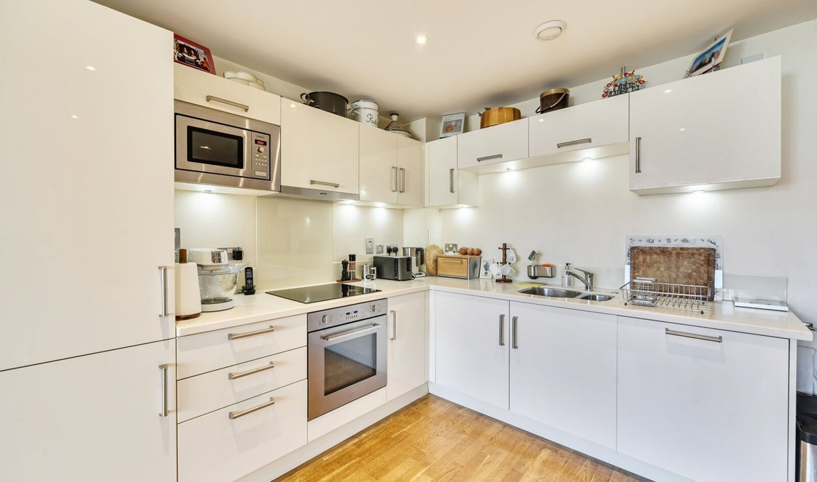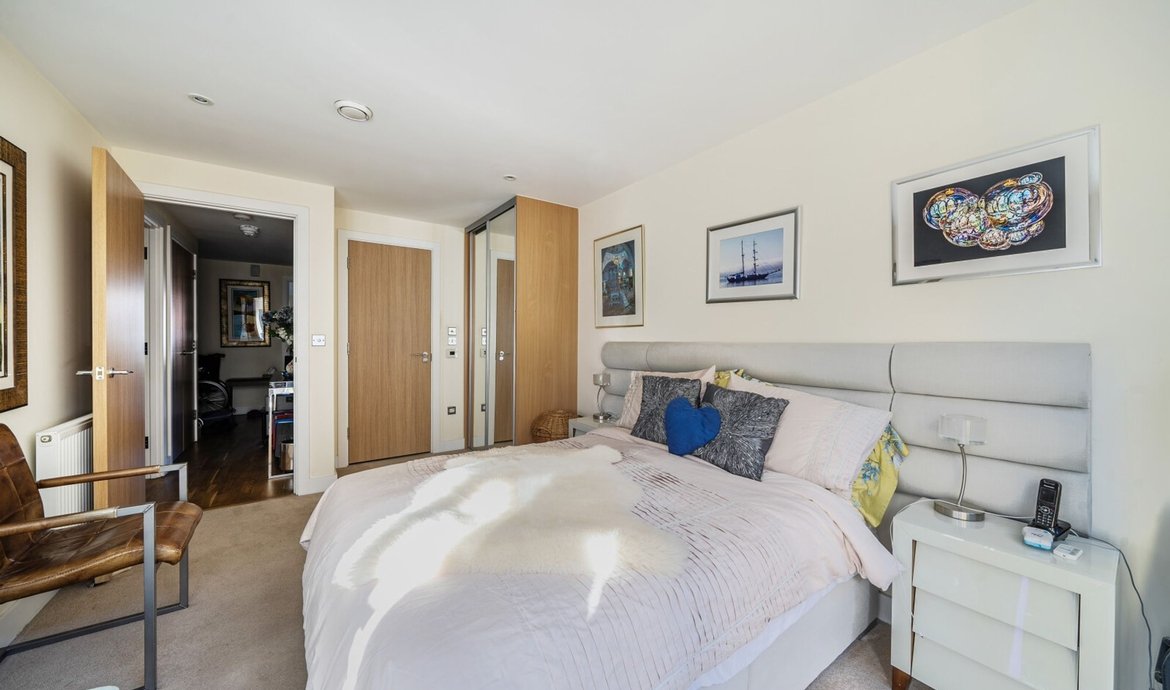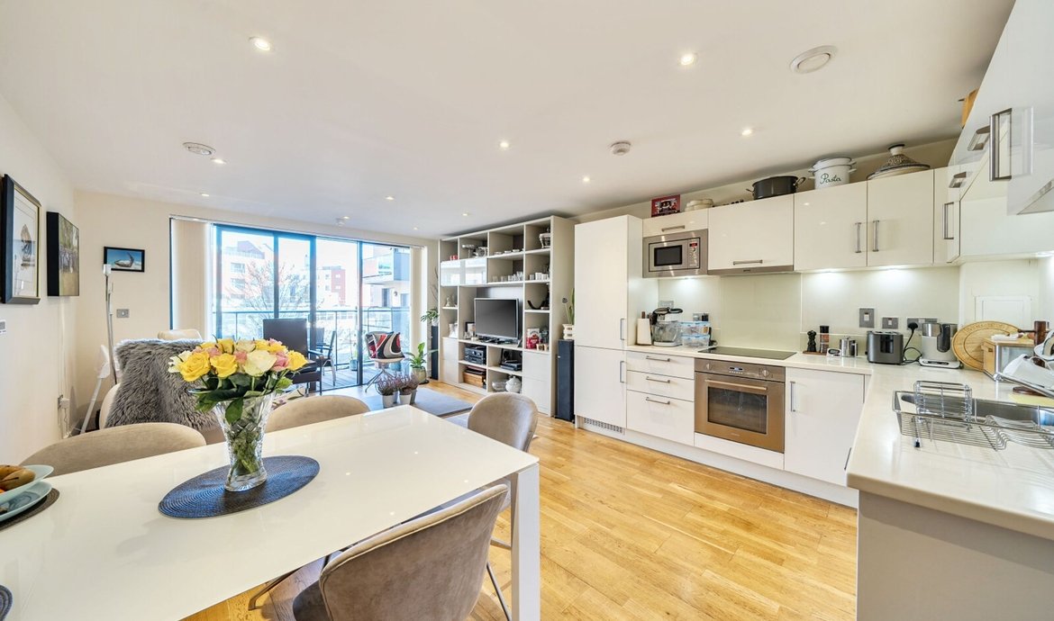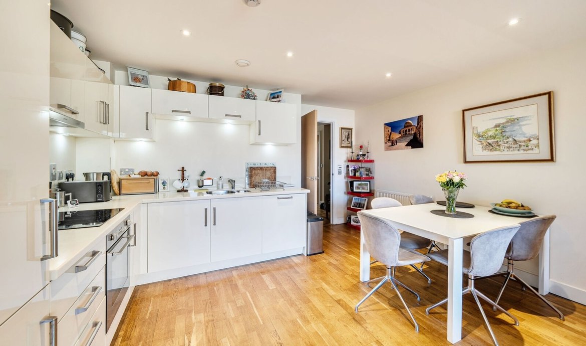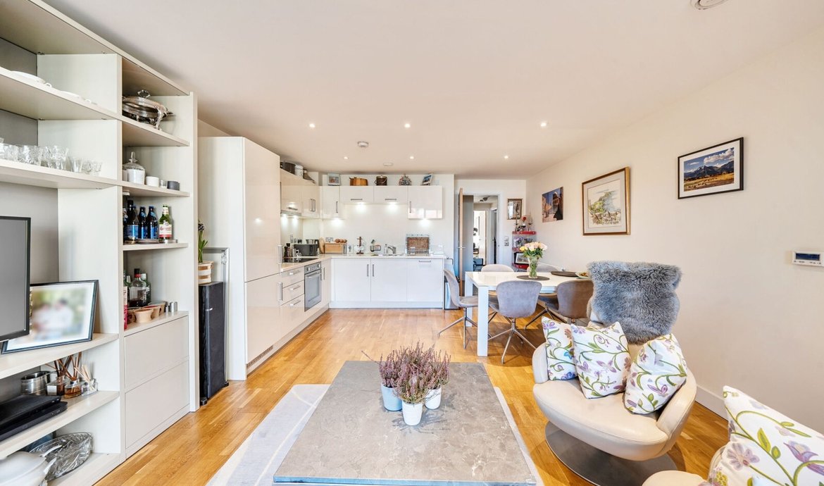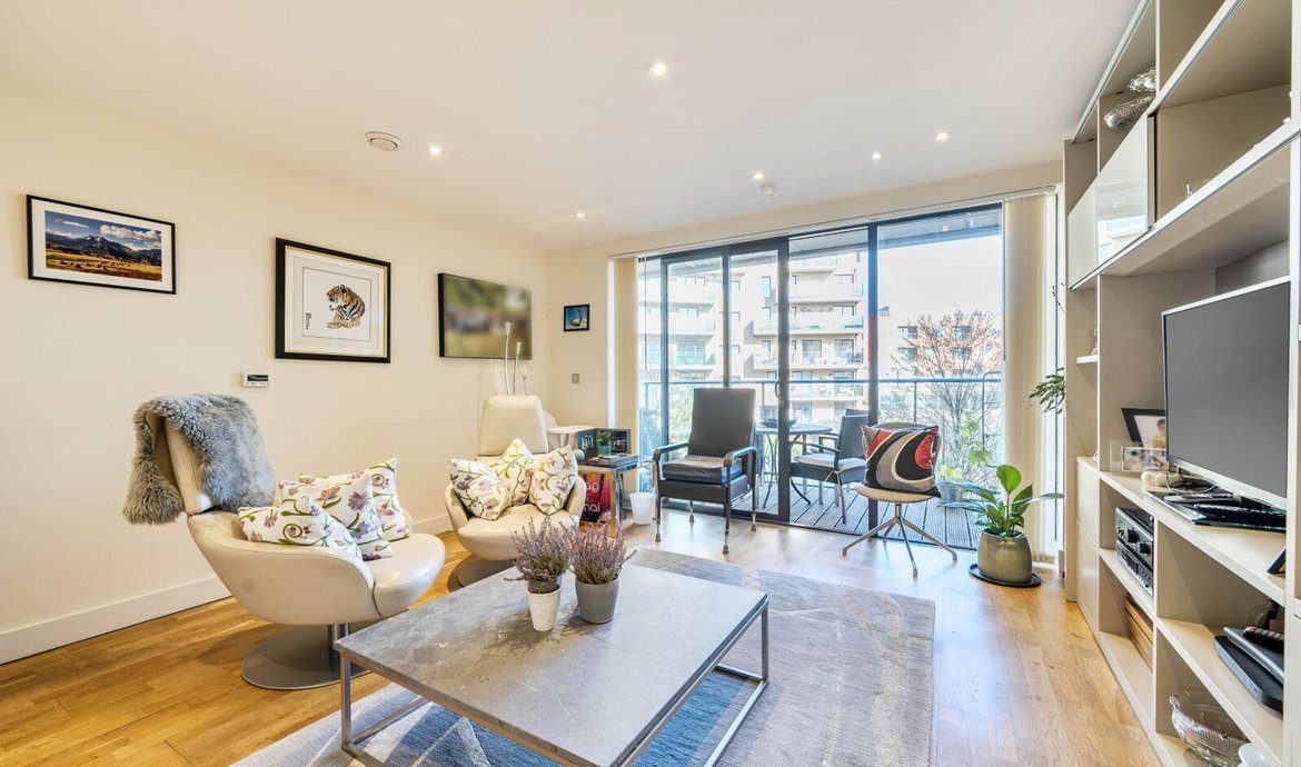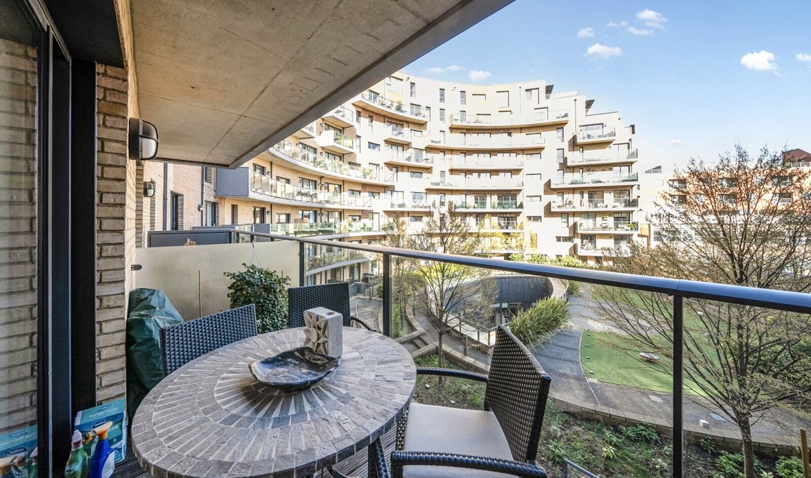 This superbly presented two bedroom flat is situated on the third floor of a popular and highly regarded development, offering a contemporary lifestyle in an enviable location. The property features a bright and spacious south facing living area, designed to make the most of the abundant natural light, with large floor-to-ceiling windows and direct access to a full width balcony (perfect for relaxing or entertaining) that enjoys sweeping views over the beautifully maintained communal gardens. The modern open-plan kitchen is thoughtfully laid out with integrated appliances and sleek cabinetry, ideal for both every-day living and entertaining guests. Both double bedrooms are generously proportioned and benefit from access to a second private balcony. . The principal bedroom boasts a luxurious en-suite bathroom, while the second bathroom is equally well appointed with high quality fixtures and fittings. The property benefits from ample storage space, a welcoming entrance hall, and secure bicycle storage for added convenience. Residents enjoy the peace of mind provided by an attentive concierge service.