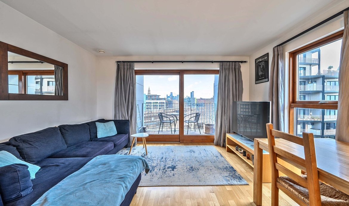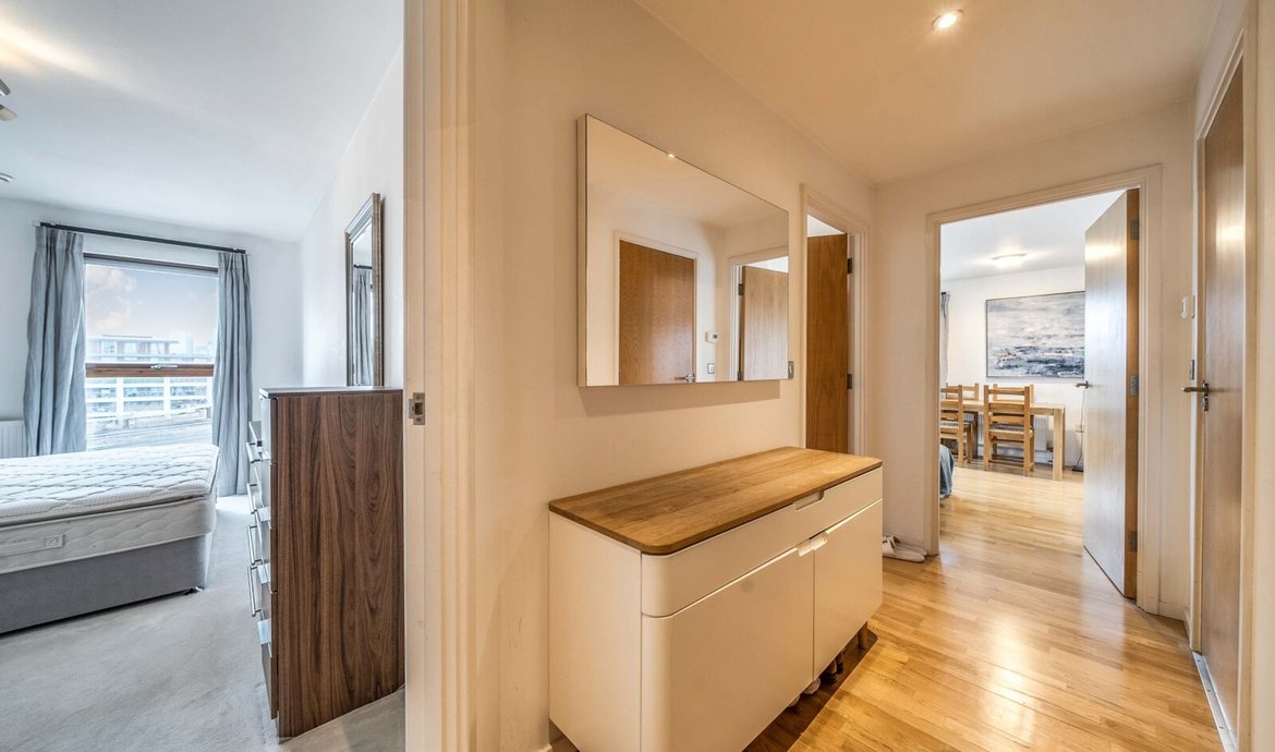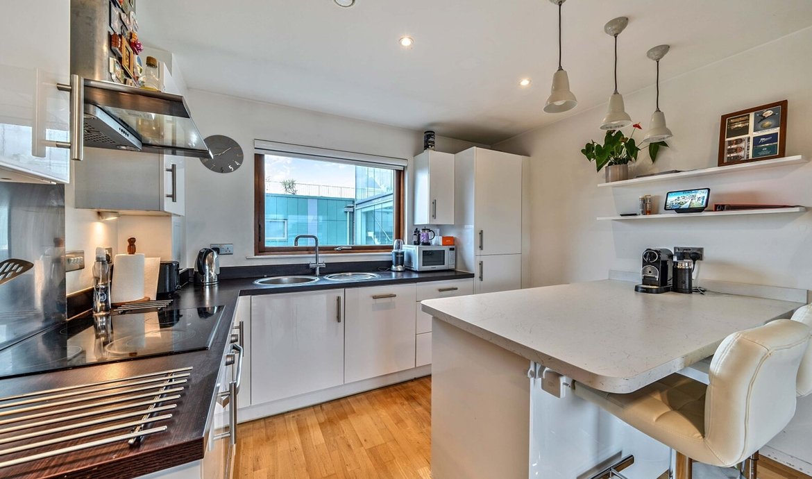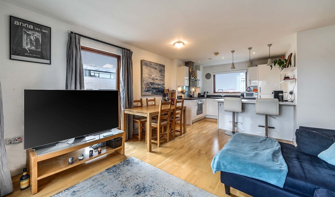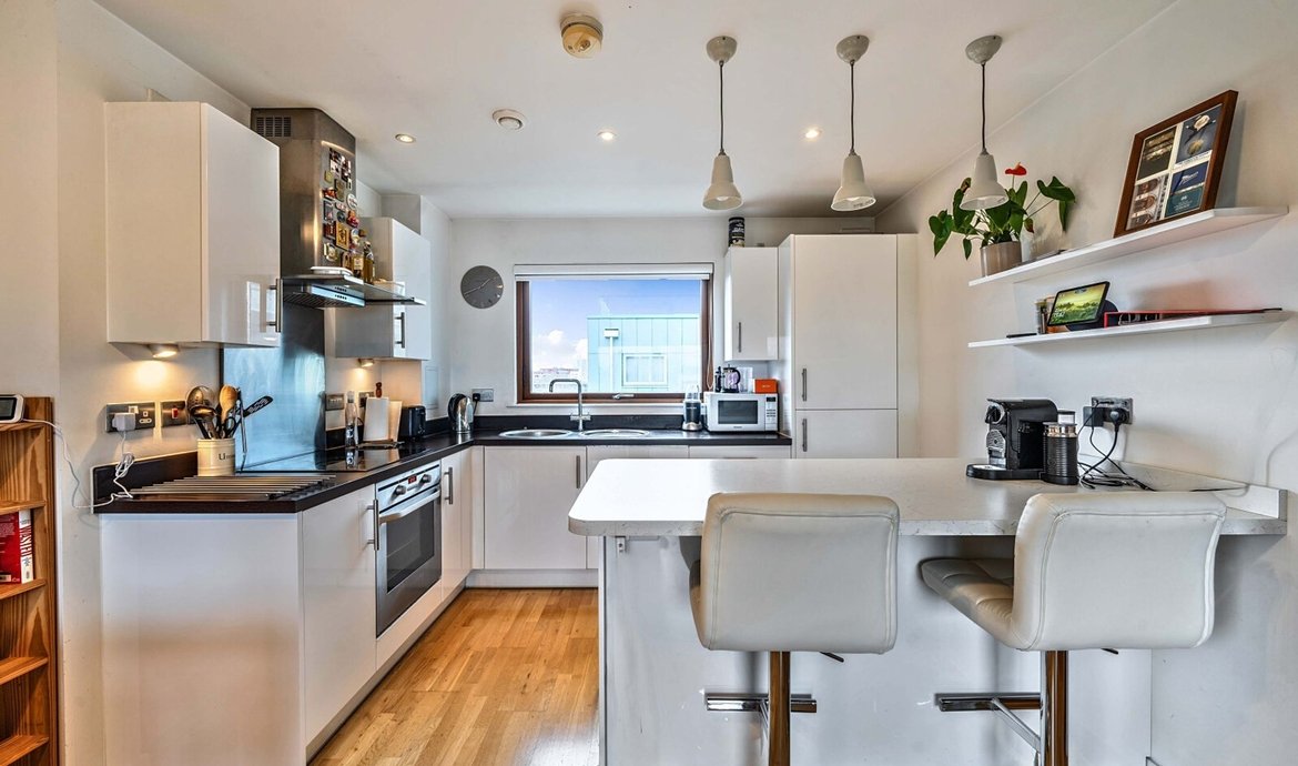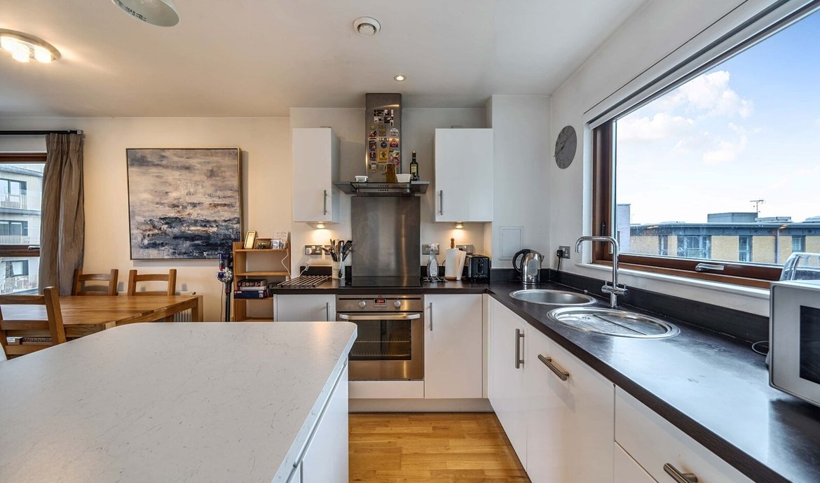 Situated within an award-winning and outstanding development, this impressive two-bedroom flat is positioned on the fifth floor, with far-reaching views and a private balcony, creating a sense of space and tranquility. Residents benefit from access to a beautifully presented communal courtyard with a striking atrium, while the flat itself is thoughtfully designed to maximise comfort and style. The spacious open-plan living area is flooded with natural light, making it an ideal setting for both relaxing and entertaining. The comprehensively fitted and fully equipped kitchen features high-quality appliances and ample storage, perfect for those who love to cook. The main bedroom is a true retreat, boasting a luxurious en-suite bathroom and generous built-in wardrobes, while the second double bedroom offers flexibility for guests, family or use as a home office. A superbly appointed main bathroom with contemporary fittings adds further appeal. Additional features include secure underground parking, convenient bicycle storage, and the reassurance of no onward chain, making this an exceptional opportunity for both homebuyers and investors alike.