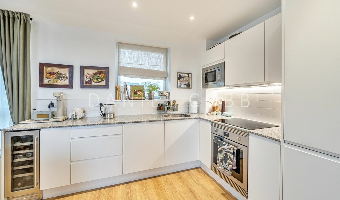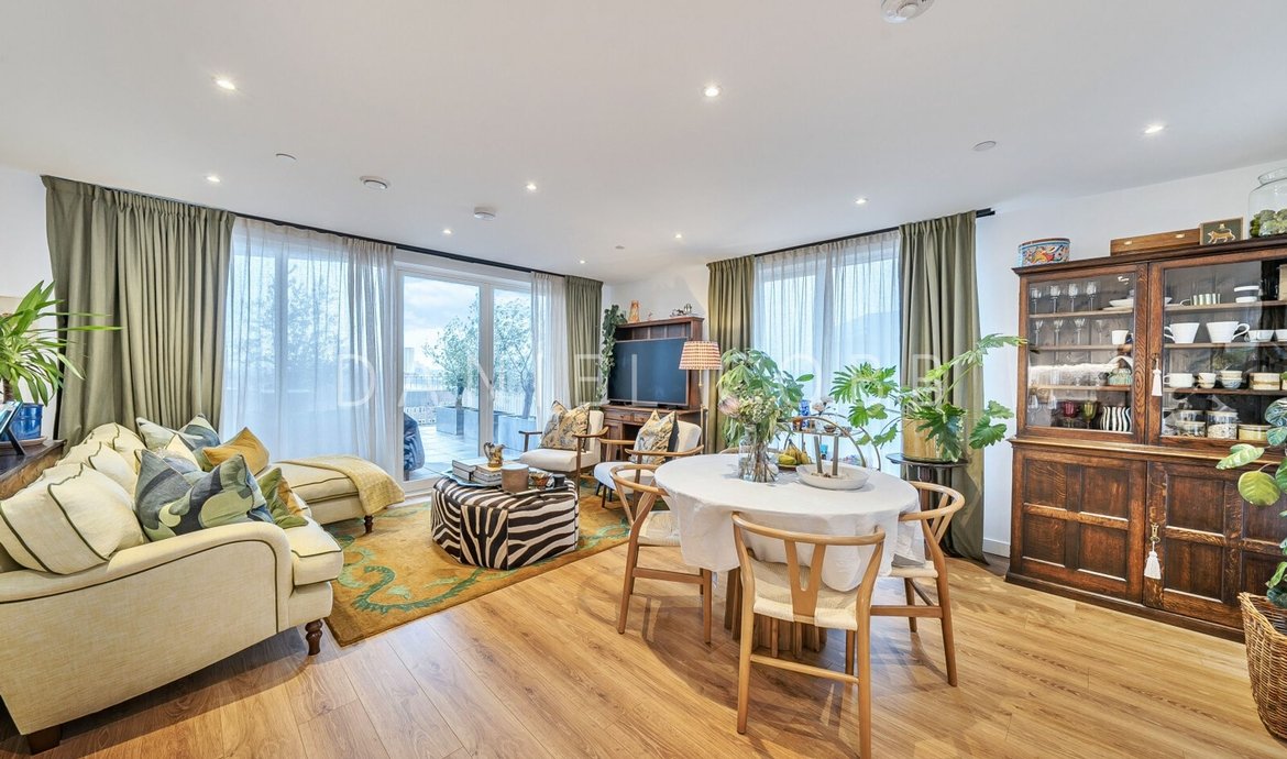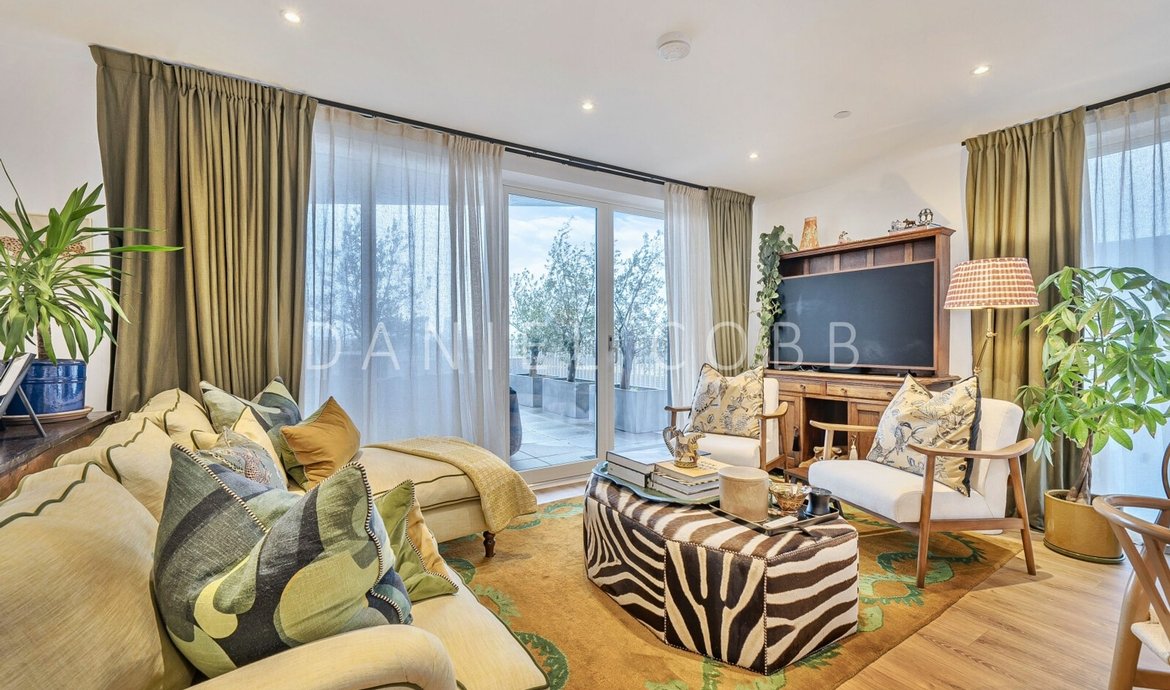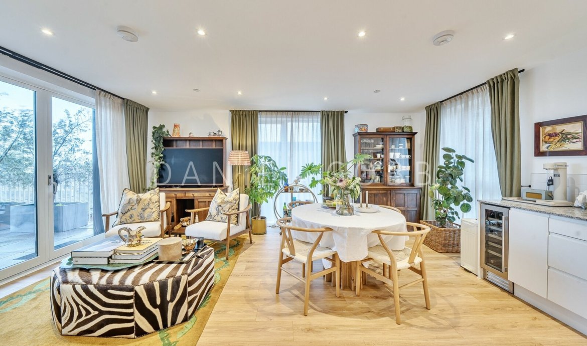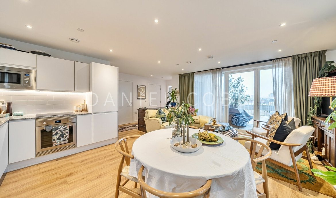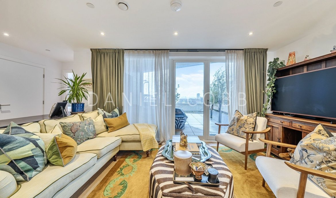 On the 5th floor of this select and award winning development , the beautifully presented penthouse style features nearly 950 sq ft of thoughtfully designed living space and an impressive double-aspect roof terrace with panoramic views. All the immaculate interior has underfloor heating and the comprehensively fitted and fully equipped kitchen has integrated SMEG appliances. The triple aspect and generous living space is flooded with natural light from the 3 pairs of floor to ceiling glazing with a seamless opening to the private terrace providing a fantastic outside entertaining space. The kitchen is fully fitted and equipped. The main bedroom, with an extensive range of fitted wardrobes, features its own en-suite shower room, while the main bathroom boasts a bath with shower above. The flat has excellent storage with the double cupboard serving as a laundry/utility. The development benefits from a landscaped central courtyard and two communal roof terraces with comfortable seating and year-round sunlight.