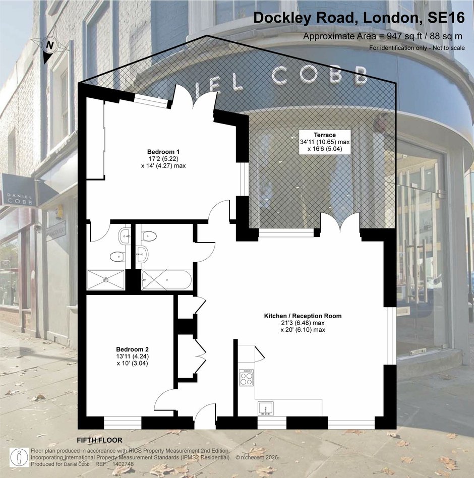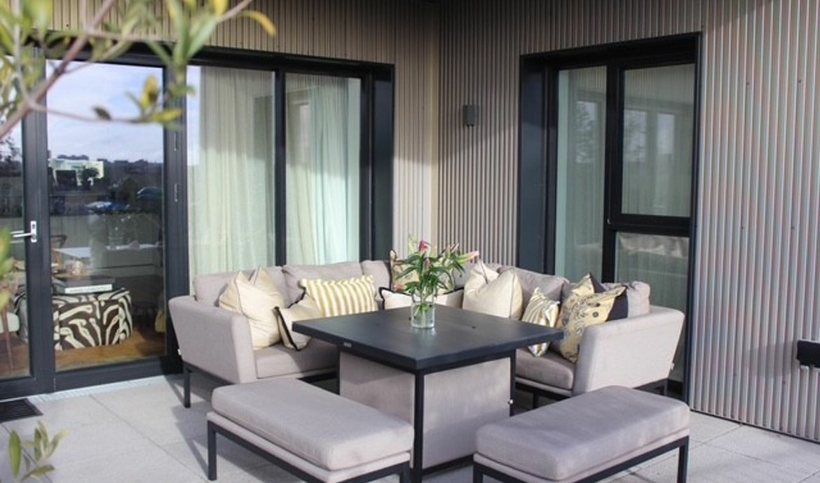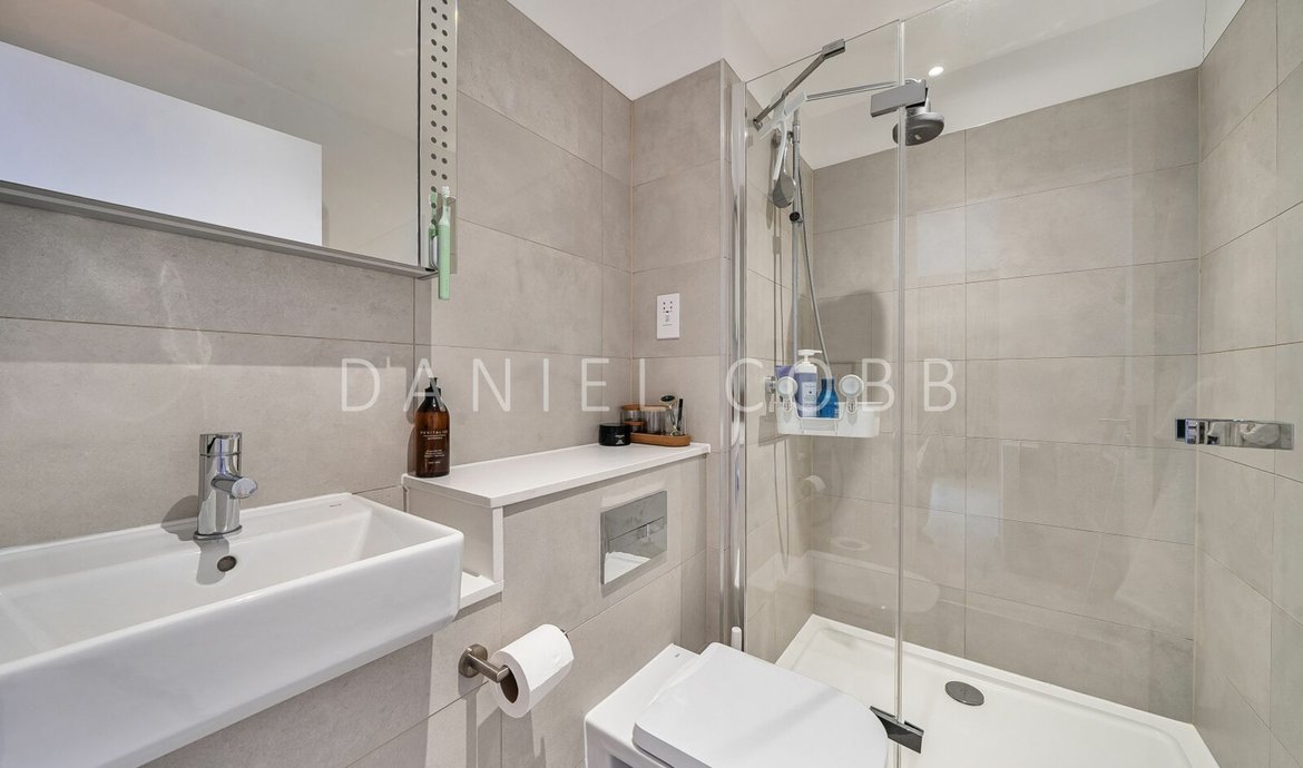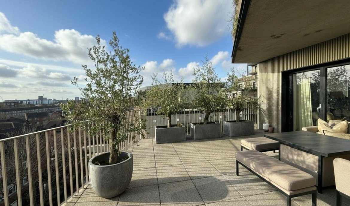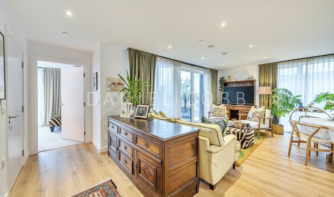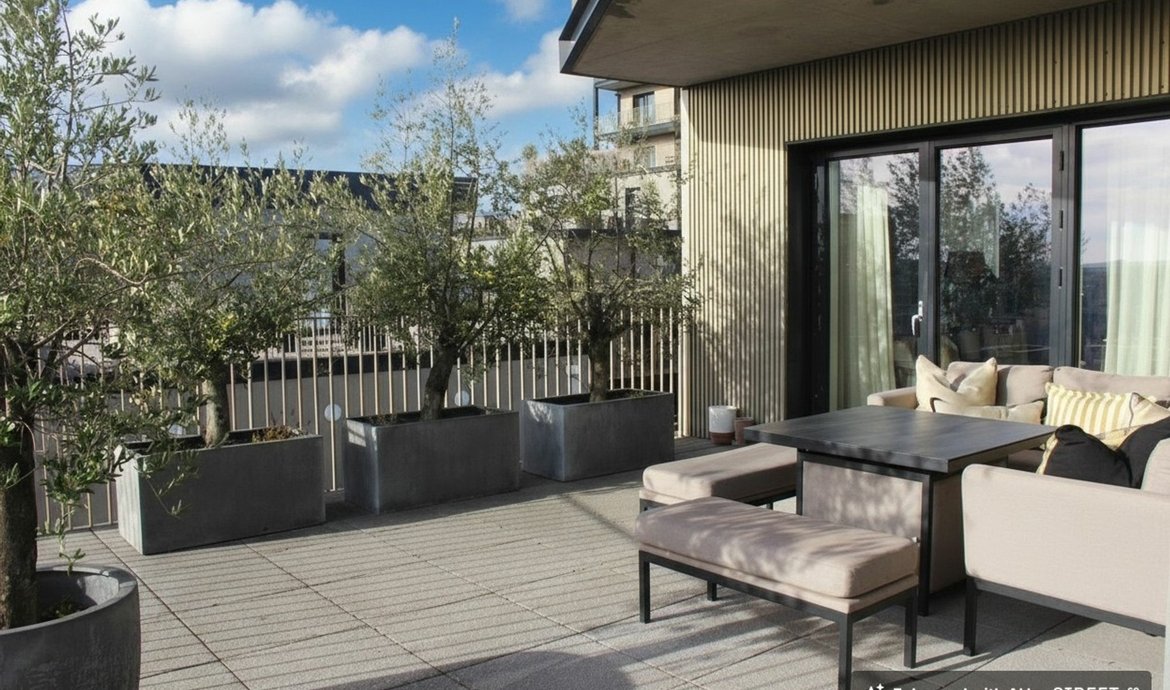 On the 5th floor of this select and award winning development , the beautifully presented penthouse style features nearly 950 sq ft of thoughtfully designed living space and an impressive double-aspect roof terrace with panoramic views. All the immaculate interior has underfloor heating and the comprehensively fitted and fully equipped kitchen has integrated SMEG appliances. The triple aspect and generous living space is flooded with natural light from the 3 pairs of floor to ceiling glazing with a seamless opening to the private terrace providing a fantastic outside entertaining space. The kitchen is fully fitted and equipped. The main bedroom, with an extensive range of fitted wardrobes, features its own en-suite shower room, while the main bathroom boasts a bath with shower above. The flat has excellent storage with the double cupboard serving as a laundry/utility. The development benefits from a landscaped central courtyard and two communal roof terraces with comfortable seating and year-round sunlight.