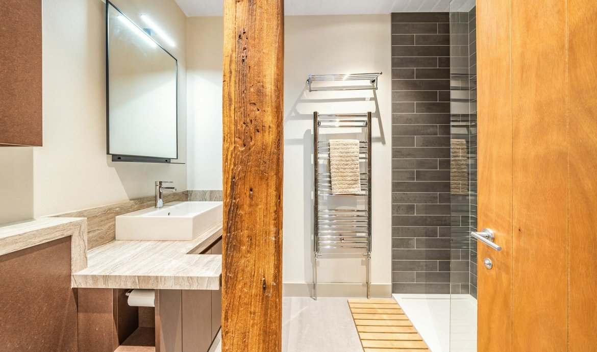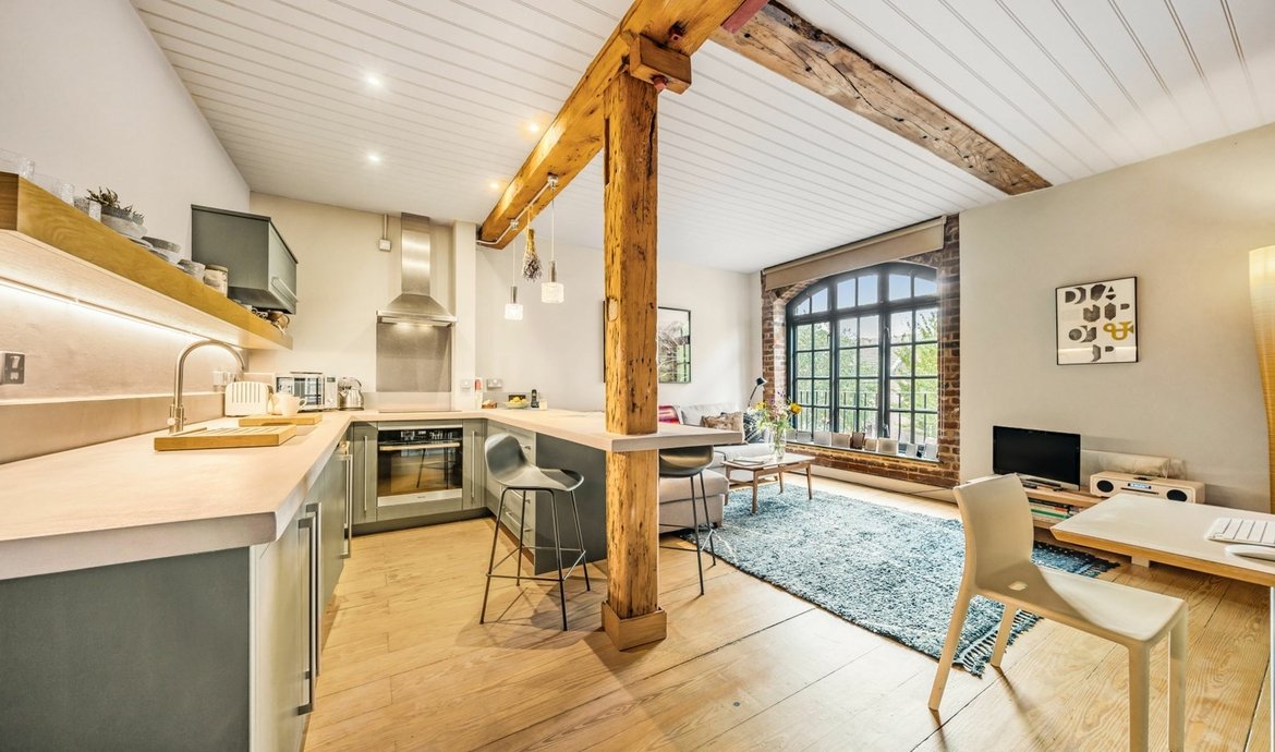 The apartment, is both quiet and securely located in the heart of this historical development and on the first floor with a west facing aspect providing excellent natural light. The spacious living space has much of the character of the original warehouse with exposed wooden beams, brickwork and warehouse style window complimented by wooden flooring and wood panelled ceiling. The stylish open plan kitchen is superbly appointed with a range of excellent storage cupboards with fitted appliances and ample worksurfaces incorporating a breakfast bar. The double bedroom also has the same features with door through to a stunning and beautifully appointed shower room with double width walk in shower.