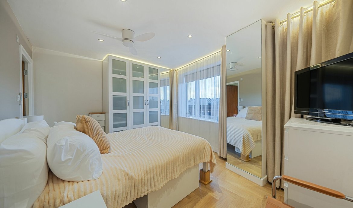 This outstanding two-bedroom flat offers a stylish and beautifully presented interior, meticulously refurbished to an impeccable standard throughout. From the moment you enter, you are greeted by a sense of modern sophistication, with every detail thoughtfully considered to create a welcoming and contemporary living environment. The spacious living area is enhanced by a striking floor-to-ceiling double glazed window, which floods the space with an abundance of natural light and creates a bright, airy atmosphere. The reenforced timber floor, laid with herringbone luxury vinyl tiles, adds both durability and a touch of classic elegance to the overall design. All electrics and lighting within the property have been upgraded to 100 percent LED. The feature and mod lighting not only improve energy efficiency but also provide a range of ambient settings to suit any occasion. The electric programmable Economy 7 storage heating system ensures comfort and cost-effective warmth throughout the year.