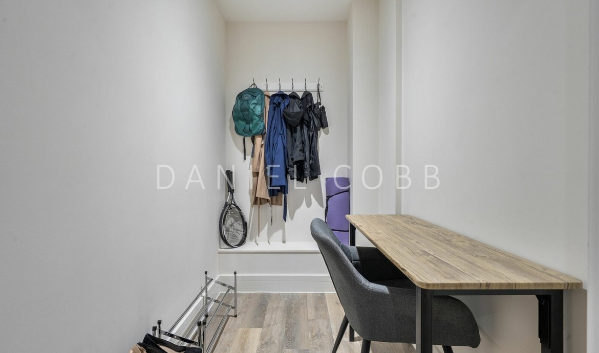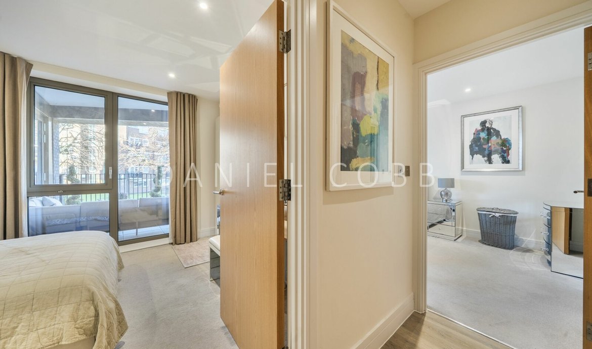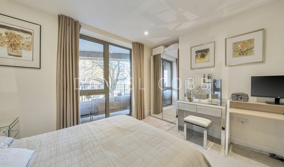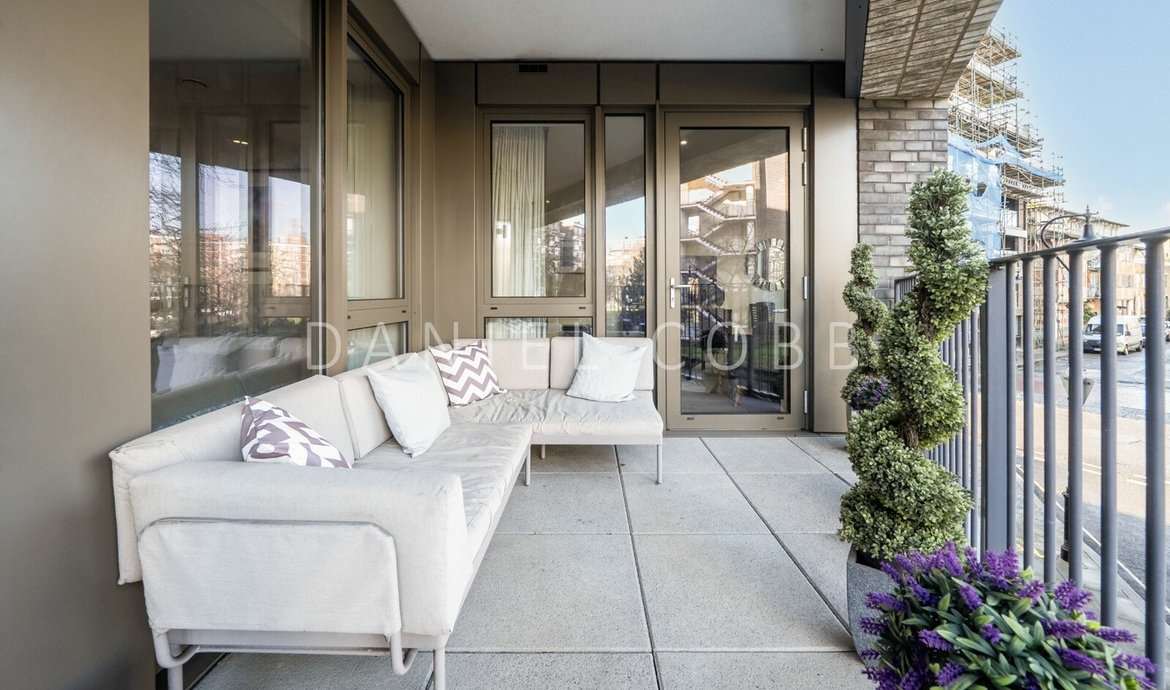 This luxurious and very spacious first floor apartment benefits from an abundance of natural light and boasts a spacious balcony. The interior with underfloor heating is flooded with natural light from floor to ceiling glass in the living room and door to the balcony. The adjacent kitchen is exceptionally well fitted and fully equipped and incorporating a breakfast bar. Both bedrooms are double rooms, the main with its own superbly appointed bathroom and door to the spacious balcony. The apartment has excellent storage including a walk in store room which is large enough to be used a study/office.