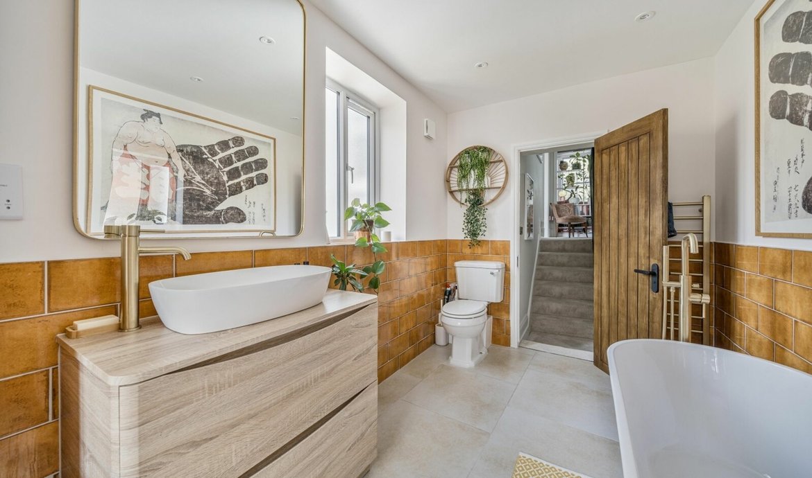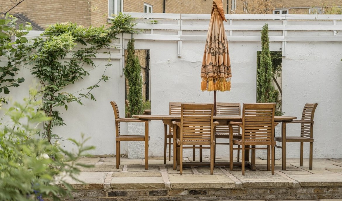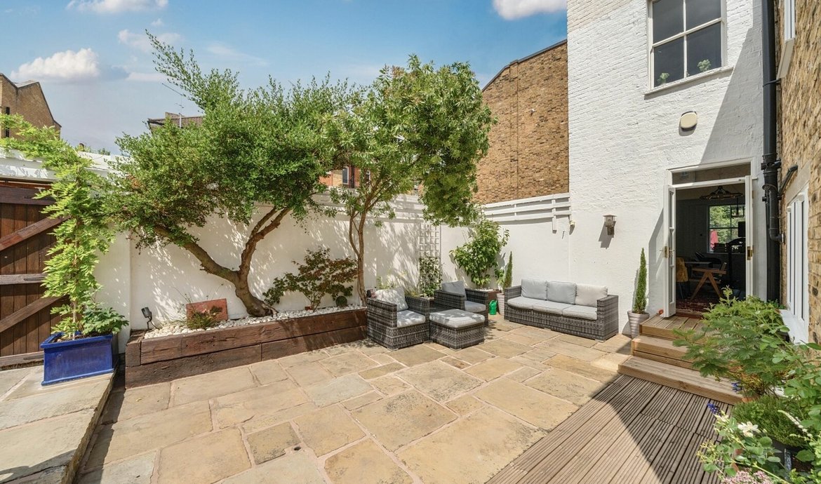 The private and walled south and west facing garden has been professionally landscaped in the recent years with extensive stone paving including a raised terrace ideal for outdoor entertaining and side terrace with raised flower beds. Double wooden gates provide access for the parking space.